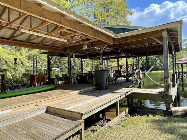 Water front cabin with boathouse and swimming dock. Fully furnished house and outdoor kitchen space. Kites Landing boat launch is -5 minutes away, dish network provided, washer-dryer. BBQ deck next to cabin and on dock. Enjoy kayaking while the kids swim. Covered dock to relax out of the sun before retiring to the main camp to watch tv and settle in for the night.