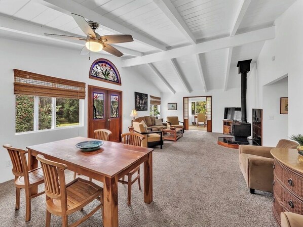Stay comfortably in Volcano, HI in this 4 bedroom house surrounded by beautiful greenery and wildlife. . Bedrooms features queen beds, offering guests plenty of space to relax. The bathrooms includes a shower over tub, and a primary suite with jetted tub to relax anfter a long day hiking and exploring the Big Island. A laundry room with washer/dryer setup. A beautiful living room with cozy sofas provides an extra spot to lounge. This soothing home invites you to enjoy peaceful moments and wonderful gatherings on the outdoor decks w barbecue. You're sure to make fantastic memories with stay at our home.