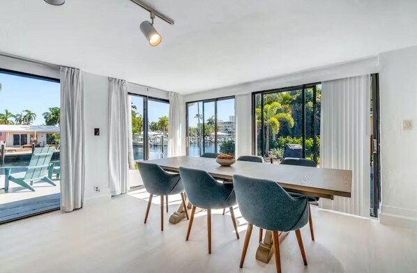 Inside, you'll find a bright interior filled with natural light, courtesy of the floor-to-ceiling windows that showcase the stunning riverfront view. The décor is contemporary yet has a beachy vibe, creating a peaceful atmosphere throughout the space. Relax on the plush furniture and share stories with loved ones. Prepare delicious home-cooked meals for your family at the formal dining table, using the fully-equipped kitchen with stainless steel appliances and a breakfast bar. If you need to stay connected, a dedicated workspace with a desk and chair is available for remote work.
