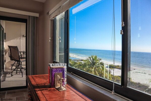 You have a view of the Gulf from nearly every room from this sunlight-filled, island condo. The living area leads directly to a screened in lanai, newly furnished with patio furniture perfect for dining al fresco. Take in the sea breezes while you relax and read a book. Enjoy your first cup of coffee in the morning while you watch the dolphins swim by, and then catch our world famous sunsets while sipping a glass of wine - all from your very own lanai.