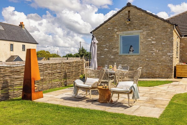 The outdoor realm beckons with a garden space, thoughtfully furnished with a table and chairs for al fresco dining, allowing guests to relish meals while soaking in scenic vistas. To facilitate moments of relaxation and contemplation, loungers and a fire pit provide a tranquil retreat. Adding to the culinary delights, a new gas BBQ and a Pizza Oven have been thoughtfully installed, enhancing the outdoor culinary experience.
