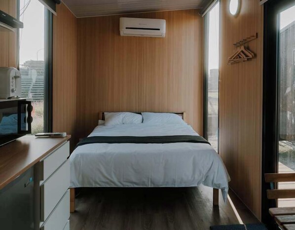 這座微型屋不僅是一個住所,更是一處與大自然共生的舒適空間。簡約現代的設計,搭配溫暖的木質調,讓人彷彿走進了一座與森林相融合的小屋。室內空間約4.3坪,環境舒適,配備完善的水電供應、分離式冷氣、小廚房、烹飪器具及衛浴設施。