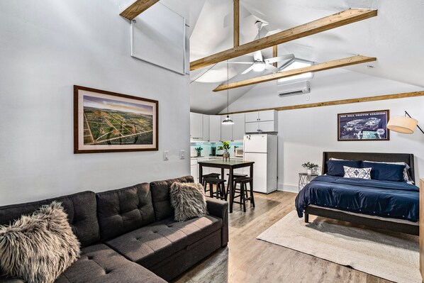 Inside our spacious studio with vaulted ceilings you'll find a Queen Platform Bed, Kitchen, small Sofa Sleeper, Full Bathroom, and Large Closet. Enjoy live programming with YouTube TV and streaming on Apple TV with our wireless internet.