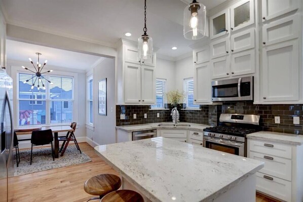 Very nice layout with 3 extra large bedrooms, all with king sized, comfortable beds. Main floor with master bedroom & two additional bedrooms downstairs worked out perfect for our adult daughter & us. Kitchen was well appointed for cooking. Nice large dining table where we played games would fit many people. The back porch had nice seating and a small view of the gulf only a few blocks away. We absolutely had no issues with the home & stay instructions were clear & helpful. Convenient walking distance to restaurants on the Seawall. Exceptional vacation home!!