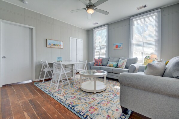 Flip Flop Heaven! Beauty on Ball - Main 3 is located in the heart of Galveston's East End Historic District in close proximity to UTMB, the Strand, and the beach. This charming pet-friendly flipflop-themed apartment is just what you need to get a taste of Galveston on a quick visit or an extended stay. It includes 1 king bed, 1 memory foam couch bed, full kitchen, full bath, and laundry facilities. It's the perfect island getaway!