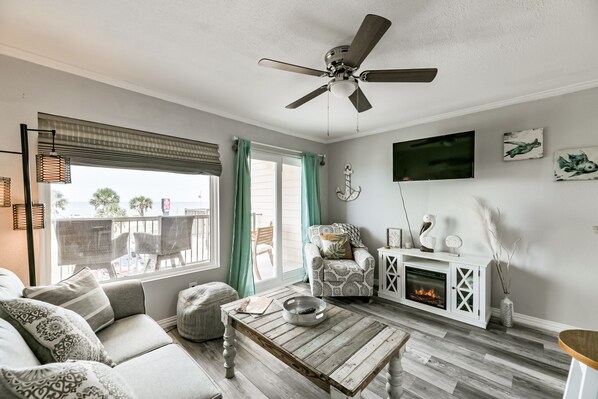Coastal Therapy!! Enjoy your morning coffee while you take in the great ocean views! Gorgeous 1/1 with bunk beds overlooking the ocean. Living room also features a sleeper sofa for additional guests. This beautiful condo has a fully stocked kitchen so you have all the necessities if you choose to dine in. There is a large granite breakfast bar with plenty of seating to sit if you choose to dine in. At the end of a long day on the beach, relax in the comfy bed in the primary bedroom. There is also a tv and large storage closet for your use. The luxurious bathroom has been remodeled with a walk-in shower and granite vanity. There is also a linen closet to store you additional needs. There may be some variations in furnishings or decor since pictures were taken.