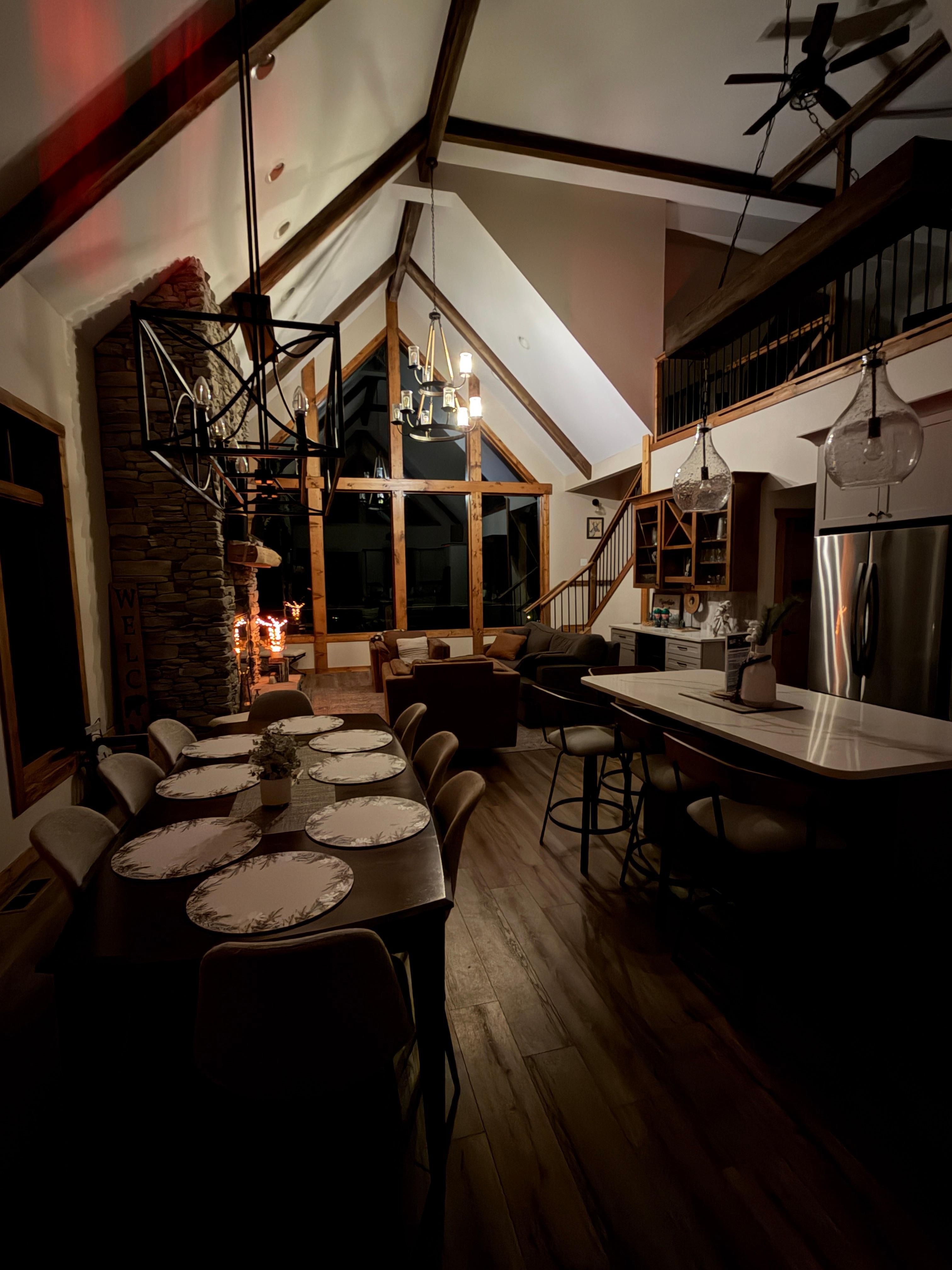 -Perfect for Groups: Open great room with a stone gas fireplace, large dining table, and plenty of seating to gather and enjoy each other's company.