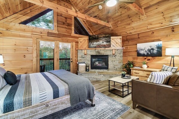 Escape to the heart of the Smoky Mountains at 'Two Hearts', a stylish studio cabin perfect for couples. Relax in your private 2-person hot tub or unwind by the stacked stone gas fireplace, and enjoy a fully equipped kitchen with coffee bar.