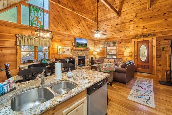 Experience rustic log cabin living with all the comforts of home in Cozy Nest Cabin! Thoughtfully appointed and decorated, the cabin features cozy and inviting living spaces, beautifully adorned with a charming bird theme. The grand three-sided wraparound porch extends the living space outdoors, backdropped by the peaceful wooded setting of Mountain Shadows Resort.