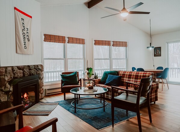 Inside, you can warm up by the gas fireplace. We have a cozy living area with plenty of seating and space to curl up with a good book or the remote to the television. The large dining table is great for game nights, and our growing collection of vinyl records add to the fun.