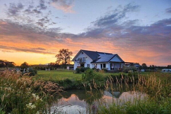 From July 1st to August 31st, April 30th to May 3rd, and June 3rd to June 7th, a buffet breakfast is included in the price. Outside these dates, guests can purchase breakfast on-site for PLN 50 per person. For animal and nature lovers, we offer horseback riding lessons for adults and children of various skill levels (for an on-site fee). We invite you to spend an unforgettable time at our agritourism farm – the perfect place to relax away from the hustle and bustle of the city, surrounded by nature and beautiful landscapes. It is strictly forbidden to organise any student party, bachelor party or drinking party in this house Bring towels. Non smoking accommodation. Dogs are to be kept on a leash. Layout: On the 1st floor: (open kitchen(dining table, electric kettle, boiling water tap, cooker(2 ring stoves, electric), microwave, fridge-freezer), Living/bed room(double sofa bed, TV, seating area), bedroom(double bed), bathroom(shower, washbasin, toilet)) stables, Internet access, Horse riding, garden(shared with other guests, fenced, landscaped garden, 3 hm2), garden furniture, sun loungers, BBQ, parking, trampoline, pond, play equipment, hairdryer, Swing set