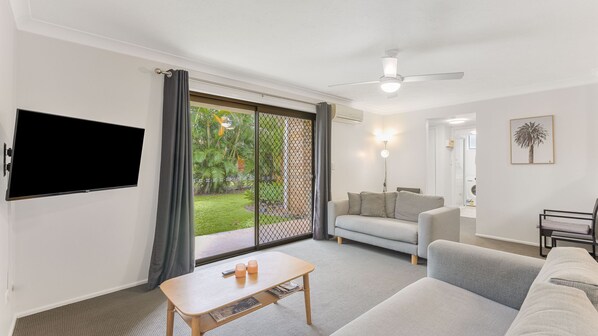 The ground floor unit features 2 bedrooms – master with double bed and the second room with 2 single beds. Both rooms have ceiling fans for year-round comfort.