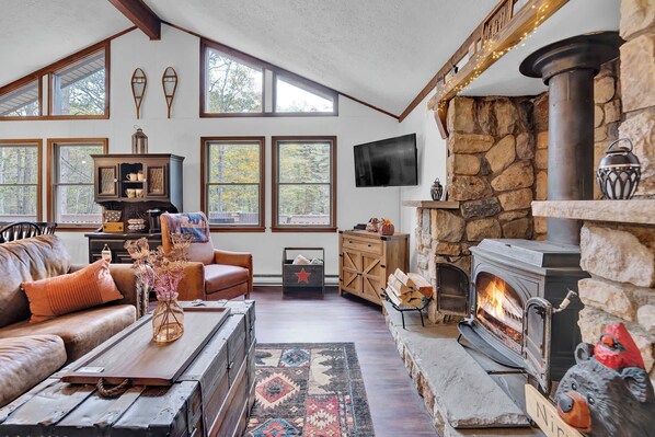 The main (upstairs) level features an open-concept great room with soaring ceilings, skylights, expansive windows, and a wood-burning stove at the heart of the space. The cozy leather seating area is perfect for unwinding after a day of exploring, while the adjacent dining area, kitchen, and sunroom make hosting meals effortless.