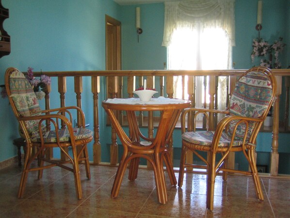 It has a green area with a construction where there is a grill and a wood oven, also have a table and chairs. It has three areas to eat next to the kitchen, another in the living room and another in the cellar-living room- dinning room.