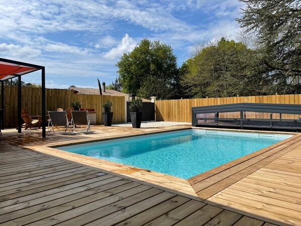 The swimming pool is heated with a heat pump and thanks to the telescopic shelter night swimming is nice because you are like in a bubble!!! The house is located in the town of Grayan 9 KM from SOULAC/mer 5 Minutes by car, 10 km from Montalivet. Our supervised beach is 5 km away and you will find sports activities for your children on site. Car parking is free as well as bicycle parking. Sliding sports, horseback riding on the beach or in the forest. 5 km from the Euronat thalassotherapy centre. Going up towards Le verdon/mer you have a tourist port with its restaurants and sports activities (jet ski, sailing lessons, etc.). Located in the heart of the Médoc, a stone's throw from the route des châteaux with these vineyards known throughout the world!!