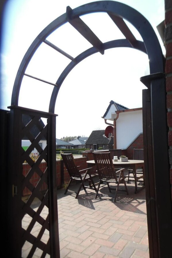 Outside, a terrace with awning extends your living space into the open air, while the small garden area, which is for communal use, invites you to relax. There is a car parking space directly in front of the house, which makes arriving and departing as well as planning day trips extremely convenient. The peaceful atmosphere of the garden is the perfect retreat to unwind or enjoy a good book.