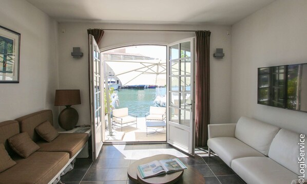 The house consists of a beautiful living room with open and fully equipped kitchen. Enjoy the west facing terrace overlooking the Church of Port Grimaud and the market square. The mooring has a pontoon against the dock. A private courtyard exposed East will allow you to lunch in the shade. On the 1st floor, two bedrooms, a bathroom and separate toilet. On the 2nd floor, a master bedroom en suite with a shower, separate toilet and a balcony.