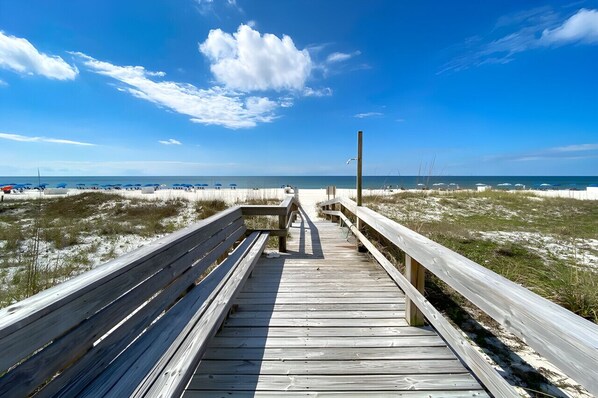 You just can`t beat the location! Three shopping centers and great dining across the street. Beautiful golf courses and marinas all within a couple miles of your door. This convenient ground floor unit has a fantastic beach and pool view right at your doorstep. If you`re on the beach and need to run up to the condo, no problem, your door is just steps away. Stay here and eliminate all the hassles of long treks to the beach. We also have another ground floor unit if your party needs more space.