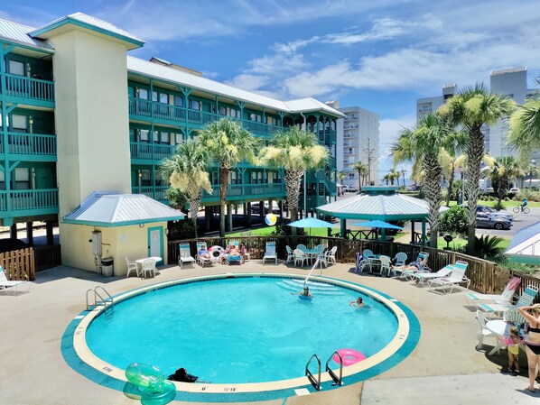 Sea Breeze has two elevators and dedicated parking. The property's shared balcony wraps around a very nicely landscaped pool area, complete with a gazebo with a picnic table and BBQ grills.