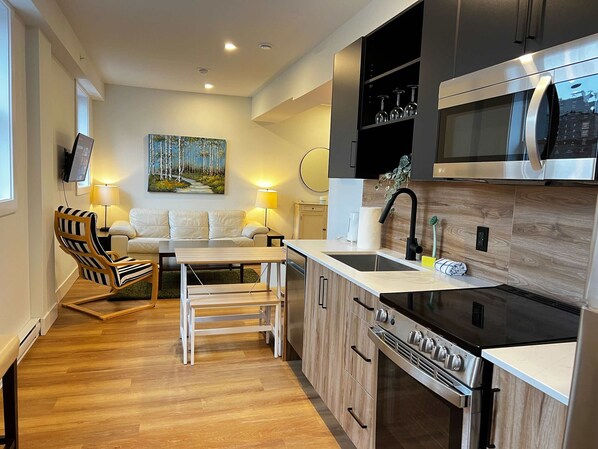 Harbor’s Edge exudes timeless elegance, combining refined decor with modern amenities to create a sanctuary in the bustling heart of Halifax. The master bedroom features a queen bed with soft lighting from wall sconces, while the second bedroom offers a cozy queen bed with a bedside lamp. Blackout blinds throughout ensure restful nights. This compact yet spacious unit is perfect for up to four guests on short stays or two guests seeking an extended escape.