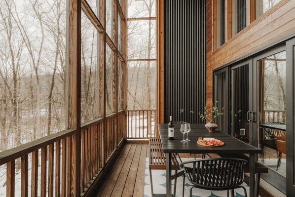 Highlights: Living room with smart TV & record player Wood stove with firewood provided Reading nook Screened-in deck with dining table