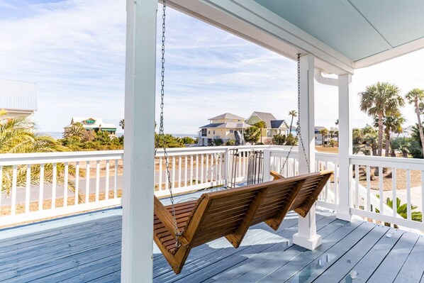 The front deck offers a swing bench, outdoor dine seating, and wonderful views of the beach. Many guests enjoy their morning coffee or after dinner drinks here, we think you will too! The third floor deck has seating as well for anyone looking to soak in the stunning ocean views.