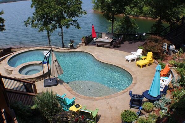 The lower level includes the Billiards room, beautiful bar with seating and a fireplace. Offset with two king bedrooms each with full baths. Bedrooms walk out onto large covered deck with access to pool, hot tub and the lake.