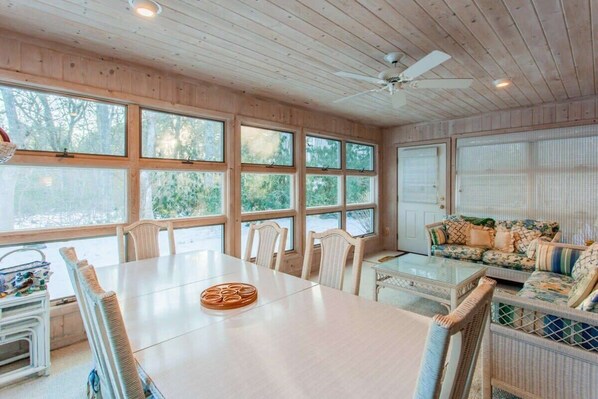 The updated kitchen features stainless steel appliances, including a gas range, and opens to a dining area with seating for six. There’s also additional seating on the screened porch — a great spot for evening meals or morning coffee.