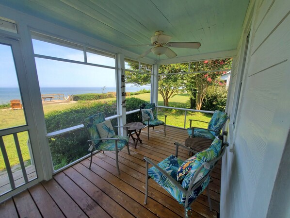 Try'n Rest. The name says it all, really. This vintage 4 bedroom cottage, with a new family room addition, sits on the shore at the mouth of the Potomac River overlooking the Chesapeake Bay. Try'n Rest has a fully equipped kitchen, central heat and air, 2 full baths and a large screened in porch. It can accommodate up to 8 guests. A panoramic view of the Bay is enjoyed from the living room, porch and front bedrooms.