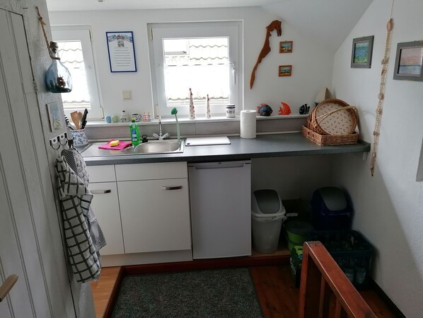 Holiday: The approximately 23m ² apartment on the upper floor can be reached via a narrow staircase (non-smoking) and has 2 single beds, 1 living room with couch and seating including satellite TV, a mini kitchen with two hobs, coffee machine, toaster, kettle and fridge and 1 separate toilet /Shower. Seating in the garden invites you to linger.