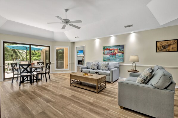 Step outside to a serene backyard oasis nestled among Lowcountry greenery, perfect for relaxation and recreation. Lounge by the pool, dine al fresco, or launch a kayak directly from the private dock into the Palmetto Dunes lagoon system.
