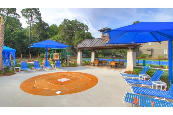 Spinnaker Shipyard Resort in central Hilton Head offers a full vacation experience with an on-site pool, kids' splash pad, playground, free greens fees at nearby golf clubs, daily tennis at Van Der Meer Racquet Club, and private decks with lagoon and golf course views.