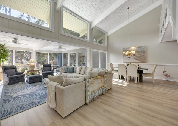 Melt into the absolutely stunning view from this bright, spacious three bedroom villa in Fairway Lane. Perhaps no other view is quite as perfectly Sea Pines as this one. This well maintained villa has been in the same family for decades, and they are opening the doors to share their gem with others. You will enjoy the three large bedrooms, all with private en suite bathrooms, an unbelievably comfy sectional that will bring the whole family together, and plenty of extras to make the stay even more special. A quiet expanse of beautiful white sand beach is only about a ten minute walk from the property, utilizing beach access #45 across N. Sea Pines Drive. The neighborhood also offers guests free practice tennis courts on site. But, the amazing lagoon and golf view from the Carolina Room is really what sets this property apart. If the wildlife and exquisite live oaks are not enough, grab one of the extra clubs from the kitchen pantry and enjoy some putting on the practice green located on the other side of the bridge.