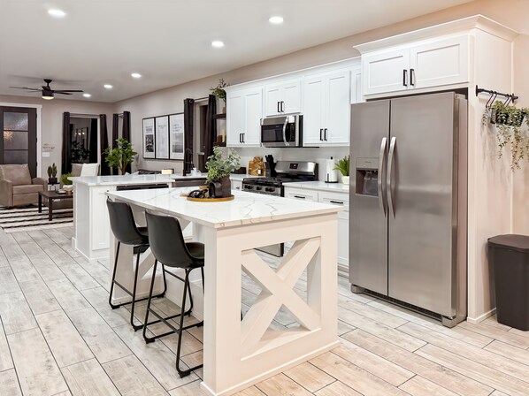 Spacious Modern Home 3BR/2.5BA - Sleeps 8+ Size Groups Welcome to your perfect getaway! This beautiful home offers modern style, comfort, and plenty of space for your whole group. It's designed for relaxation and convenience. Ample parking! The open-concept fully equipped kitchen, dining and living area is ideal for quality family time. Enjoy evenings in the spacious living area or cook a feast in the kitchen. Perfect for families, friends or business travelers seeking a stylish home base. The space Primary Room has king bed private restroom and walk-in closet. Queen bed room is almost spa like. Room with the view features full size bed with twin sized bunk beds. Excellent living area - bar area - kitchen and dinning room. Unwind in our super comfy back yard! Guest access Enjoy the entire house.