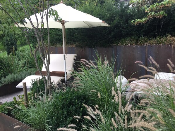 Small but nice ! This room is furnished and equipped to a high standard. The Mini Suite has become very popular and is booked again and again by regular guests. The room can be booked individually as a vacation apartment or added to another vacation apartment. This means that additional people can be accommodated in the Mini Suite. The two-part door leads to a large wooden terrace, which is particularly inviting in the afternoon and evening. The perfect place to relax after a wonderful day's hiking. The nearby garden area around the wooden deck and garden furniture as well as a fire bowl are also part of this apartment.