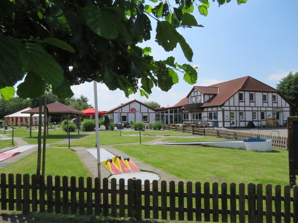 Holiday for the whole family in the holiday home Hanse in the holiday village Altes Land. The holiday village is located directly on the Elbe dike, in an old fruit farm in the community Hollern-Twielenfleth. Whether big or small - in the holiday village, all guests are the largest and the four-legged friends are welcome in most homes. In addition to a bicycle rental, a miniature golf course and a playground is also a multipurpose court for football, volleyball, Swingo bowling, bocce, football billiards and table tennis in the village. Walking for miles along the dike, cycling or inline skating, dreaming on the Elbe beach, the children play with friends and in the evening you can relax comfortably in your holiday home or in a convivial round in 2014 newly opened Café & Restaurant "Auszeit" with summer terrace. In a few minutes you can reach both the multi-generational park, the heated outdoor pool directly on the Elbe, the bike park and the beautiful Elbsandstrand. Experience a great holiday in the most beautiful Elb holiday village between the Hanseatic cities of Hamburg and Stade.