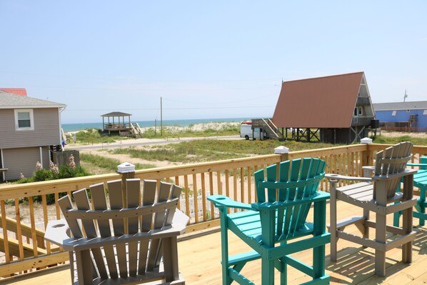 Enjoy beautiful Atlantic views from much of the back deck, and take the sandy trail for quick beach access. The fenced yard is ideal for pets, and you’ll be within walking distance of the famous Trailer Bar.