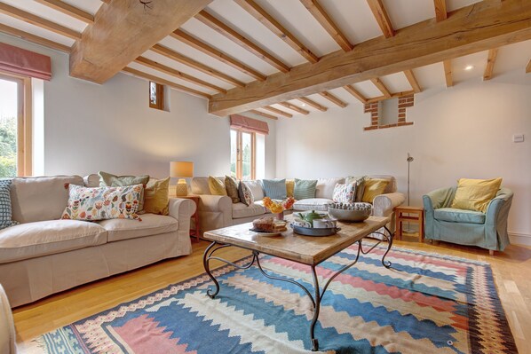 Detached barn with an abundance of period features throughout including exposed beams, exposed brickwork and vaulted ceilings. Can sleep up to 10 guests, with sleeping, living, dining and kitchen spaces on the ground floor. Five bedrooms including double master bedroom and ground floor double bedrooms with en-suite facilities. Two further twin bedrooms on the first floor.