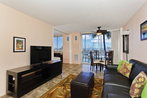 TV, DVD player - Waikiki Marina-Front Condo! Ocean & Fireworks View, Central AC, Full Kitchen! (Honolulu)