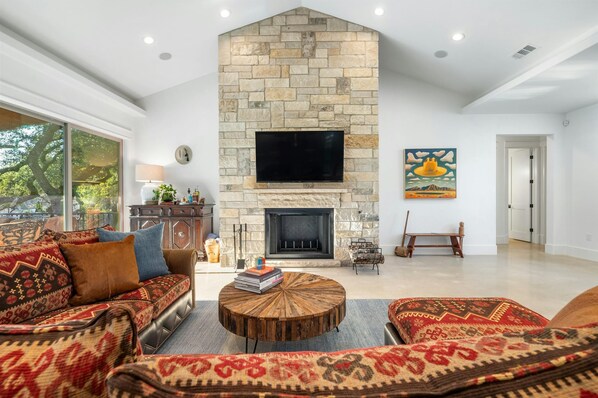 Our chef's kitchen will make any private chef or caterer happy as a clam with a giant serving island and commercial appliances. Our large wood-burning fireplace and outdoor fire pit with Adirondack chairs are perfect for any night of the year, and our double stacking LG Wash Towers can handle large groups. We have board games, luxury linens & towels, high-end kitchenware and original art throughout. We’ve thought of every detail in this Texas farmhouse-chic inspired design with furnishings throughout from Pottery Barn, Anteks and William Sonoma.