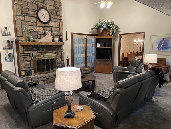 In the Great Room we have leather furnishings, cable tv, wifi, a sound bar and a wood burning fireplace ... firewood furnished.