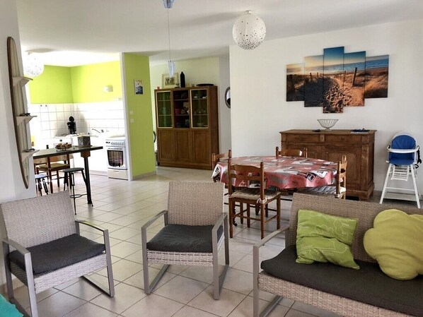 The interior features a spacious and welcoming living area, composed of a fully equipped kitchen open to the dining room and living room. This bright space invites you to share relaxing and convivial moments in a warm and pleasant atmosphere.