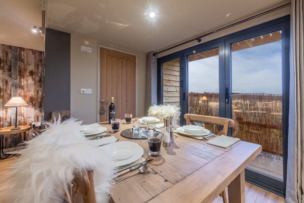 Boasting exposed oak beams combined with soft sheepskin rugs plus underfloor heating, The Bothy perfectly captures the essence of country living by the sea. On chillier evenings snuggle up in front of the bioethanol freestanding living flame fire. A sumptuous double-bed, well-equipped kitchen and an impressive wet room with monsoon shower complete this unique accommodation.
