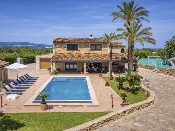 Very large, beautiful villa "Son Bosc", 2 storeys, surrounded by trees. Outside the resort, 4 km from the centre of Inca, in a quiet, sunny position residential area (villas), 2 km from the edge of the forest, 20 km from the sea, in the countryside. Private: property (fenced), garden with lawn and wildlife garden, swimming pool angular (11 x 5 m, depth 30 - 200 cm, seasonal availability: 01.Jan. - 31.Dec.). Outdoor shower, patio, arbour, pergola, garden furniture, barbecue, children's playground (slide, swing), pool maintenance by the owner/gardener. In the house: internet access, WiFi, storage room for bicycles, central heating system, air conditioning, washing machine, tumble dryer, heating available only from 01.Nov. - 31.Mar.. Parking at the house on the premises, single garage. Shop 5 km, grocery 5 km, supermarket 5 km, restaurant 3.5 km, bar 5 km, bakery 5 km, café 5 km, internet café 5 km, pedestrian zone 5 km, bicycle rental 5 km, pub garden 5 km, 60 minute walk to the centre, bus stop 5 km, railway station 5 km, sandy beach "Port Alcúdia" 23 km, rocky beach 23 km. Sports harbour 25 km, marina 25 km, golf course (18 hole) 25 km, sailing school 30 km, tennis 5 km, riding stable 8 km, sports centre 5 km, walking paths from the house 1.5 km, cycle lane 500 m. Nearby attractions: Ciudad de Inca 3.5 km, Palma de Mallorca 35 km, Mallorca Fashion Outlet & Cinemas 25 km, Pueblos:Búger-Campanet-Selva-Caimari. Playa y Faro de Formentor 35 km, Santuario de Lluc 22 km. Hiking paths: Puig de Santa Magdalena - Inca 3.6 km, Serra de Tramuntana. Please note: car recommended. Suitable for families. Object suitable for 9 adults. The owner does not accept any youth groups. Animals in the neighbourhood. Motorway 400 m from the property. Airfield 39.6 km from the property. "Son Bosc", 6-room villa 450 m2 on 2 levels. Object suitable for 9 adults. Spacious and bright, fully renovated, comfortable and cosy furnishings: large living room with panoramic window with digital TV, flat screen, air conditioning and forced-air heating. Exit to the patio. 1 large double bedroom with sliding door with 2 beds (90 cm, length 200 cm), digital TV, flat screen, air conditioning and forced-air heating. Exit to the patio. Lounge with digital TV, flat screen, air conditioning and forced-air heating. Exit to the patio. Kitchen-/living room (oven, dishwasher, 3 ceramic glass hob hotplates, microwave, freezer, electric coffee machine) with dining table, open-hearth fireplace (only for decoration), air conditioning and forced-air heating. Exit to the patio. Bath/WC, shower/WC. Upper floor: 1 large double bedroom with panoramic window Dressing room with 1 french bed (180 cm, length 200 cm), digital TV, flat screen, air conditioning and forced-air heating. (ladder), 1 double bedroom with panoramic window with 1 french bed (150 cm, length 200 cm), digital TV, flat screen, air conditioning and forced-air heating. (ladder), 1 double bedroom with panoramic window with 2 beds (90 cm, length 200 cm), digital TV, flat screen, air conditioning and forced-air heating. 1 large double bedroom with panoramic window with 1 french bed (150 cm, length 200 cm), air conditioning and forced-air heating. Exit to the balcony. 2 showers/WC, double hand-basin. Natural stone floors. Large balcony, large patio, lawn, porch. Terrace furniture, barbecue, deck chairs (9), covered balcony, sitting area. Very beautiful view of the mountains and the countryside. Facilities: washing machine, dryer, iron, children's high chair, baby cot for up to 2 year olds, hair dryer. Internet (WiFi, free). Parking (roofed), garage on the property at the house. Please note: suitable for families one double bedroom is outside the apartment. No lift. The pool mentioned in the description is for private use. ETV/11105 // Reg. Nr.: ESFCTU0000070110000267710000000000000000000ETV/111052