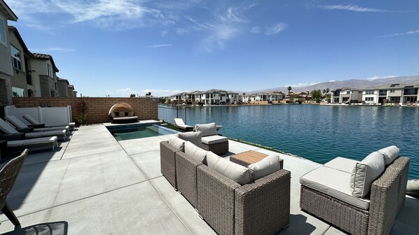 Newly built in 2023. 4 Bedroom, 4.5 Bath, Lakefront House with infinity pool. This newly built home is a corner lot so you have plenty of privacy, beautiful views of the lake and one of the biggest properties in Terra Lago. Spacious backyard for hanging out with a cocktail at night and coffee in the morning. Heated pool/spa, Game room/loft with queen sofa bed, 2 Kings, 1 Queens, 1 bunk bed with a queen and twin top, 2 roll aways. 6 miles from Empire Polo Club for Coachella, Stagecoach and all festivals. 1 1/2 mile from Fantasy Springs Casino and 2 miles from Spotlight 29 Casino. 412 game arcade, two 75 inch smart TVs with Apple TV, 55 inch TVs in all bedrooms, JBL bluetooth speaker, Drip coffee Keurig pod combo, all kitchen amenities, playgrounds for kids. Pets are welcome upon agreement with host.
