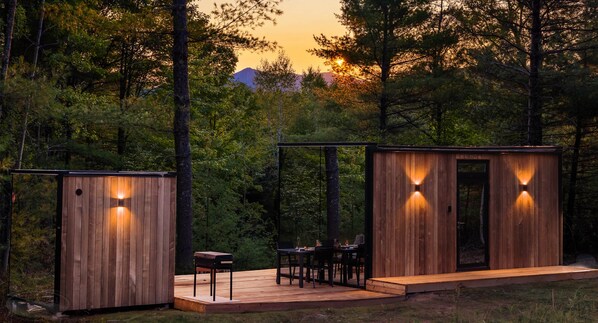 Note: Photos are composite images taken from actual photos of the property and views and actual photos of other existing ÖÖD cabins used as rentals. Interior furnishings will vary slightly. Final site mirrors this unique aesthetic in a serene, wooded setting with mountain views.