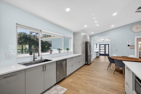 Inside, the home features a modern open floor plan filled with natural light from large windows throughout. The gourmet modern kitchen is fully equipped and perfect for home-cooked meals or hosting. Relax in the living room with a large smart flat-screen TV, or unwind in thoughtfully designed spaces with tons of storage throughout.