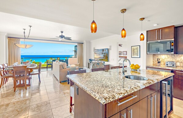 Enjoy your meals on the spacious oceanview lanai or dine indoors in the climate-controlled air conditioning. In addition, our commercial-grade Vitamix blender is well-suited to preparing creative libations and smoothies with fresh local produce.