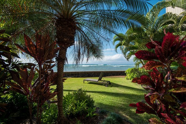 The lanai (balcony) at Seaglass is a getaway all on it's own. A majestic Golden Rain tree provides shade and privacy to this peaceful space. Dining is done "al fresco" on our teak wood table and there are several comfortable armchairs to relax in and enjoy local coffee in the mornings or a glass of wine in the evening. A sign on the wall that states "This is my Happy Place" says it all...