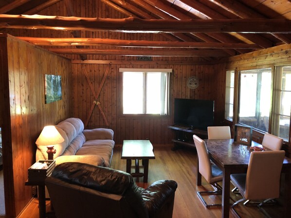 Lake Cottage located on 500 acre Portage Lake just south of Kalamazoo, Michigan. Our cabin is a clean and cozy two-bedroom wood beam and pine construction where you experience the feel of an up north cabin as soon as you step through the door. The kitchen is fully equipped with a stove with oven, microwave, refrigerator/freezer, Keurig and a regular coffee maker and a complete set of cooking and eating utensils. The dining room table along with the bar stools seat 6. The living room has a comfy couch and recliner with a 50” tv with Netflix and other apps. It is the perfect setting to reminisce about the adventure so far. One private bedroom hosts a cozy, queen size bed. The other is a bunk bed w twin bed on the bottom, with another bunk bed.